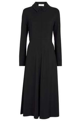 Black Midi Skirt + Black Blouse + Black Wool Coat + Fishnet Socks + Black Heels