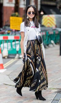 Whether office casual is getting very liberal at your current workplace, or you’re ready to turn up your suit look for an evening out, a bra top is the best way to infuse a little modernity into your tailored separates. Try it with oversized suiting like Emily Ratajkowski, with a sleek pencil skirt as seen at Michael Kors, or paired with a somber shade à la Jil Sander.