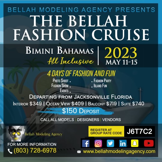 Bellah Modeling Agency is doing something completely new this year, The Bellah Cruise! This cruise includes 4 days of fashion and fun from May 11th to May 15th of 2023. There will be photo shoots, a fashion show, events, a fashion party, and island fun for the cruise to the Bimini Bahamas! If you would like to register or would like more information on this awesome and new Bellah event, please call 803-728-6978 for more information!